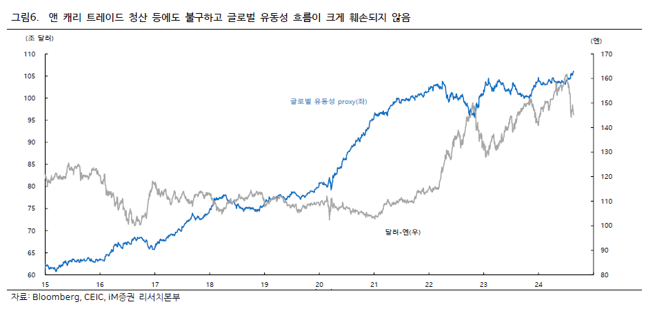 - 앤 캐리 트레이드 청산 등에도 불구하고 글로벌 유동성 흐름이 크게 훼손되지 않음